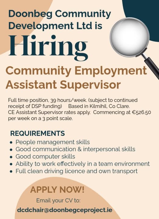 Doonbeg Community Development has a vacancy for an Assistant Supervisor for our Community Employment Project. Successful applicant will be based in Kilmihil. Details here: https://drive.google.com/file/d/1PaqHr33CqNXIU4GDaYIDUfCBfA-5BmAX/view?usp=drivesdk